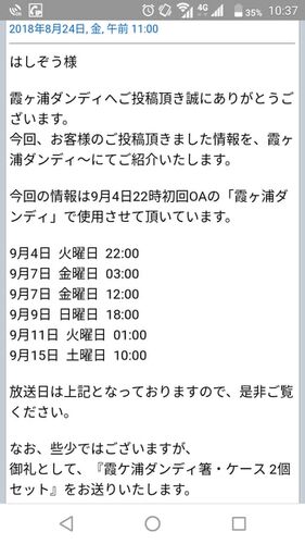 釣りビジョンから、メールが届いた。 これが、そのスクショである。 内容は、前にも書いたが霞ヶ浦ダンディーという番組内で、ダンディー飯と題して霞ヶ浦オカッパリ時の、お勧めの食事処の情報を募っていたので、51号沿いの弁当の自販機のネタを送ったの…